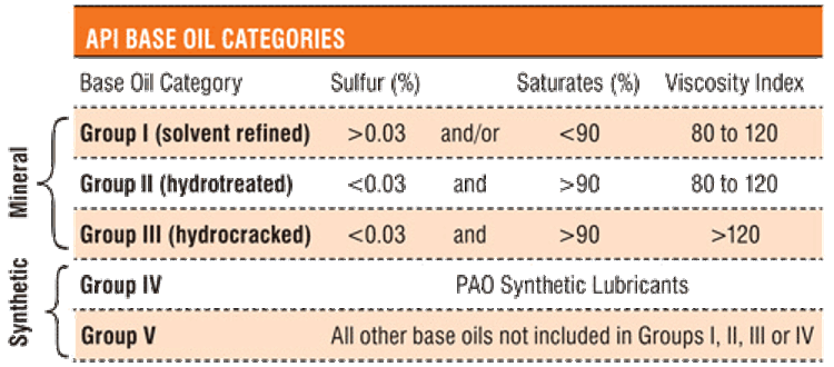 Almost every lubricant used in plants today started off as just a base Lubricants. The American Petroleum Institute (API) has categorized base lubricants into five categories (API 1509, Appendix E). The first three groups are refined from petroleum. Group IV base lubricants are full synthetic polyalphaolefin. Group V is for all other base lubricants not included in Groups I through IV. Before all the additives are added to the mixture.