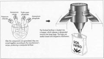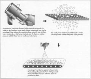 To produce fertilizer in the most usable form, each of the different compounds, ammonium nitrate, potassium chloride, ammonium phosphate, and triple superphosphate are granulated and blended together. One method of granulation involves putting the solid materials into a rotating drum which has an inclined axis. As the drum rotates, pieces of the solid fertilizer take on small spherical shapes. They are passed through a screen that separates out adequately sized particles. A coating of inert dust is then applied to the particles, keeping each one discrete and inhibiting moisture retention. Finally, the particles are dried, completing the granulation process.